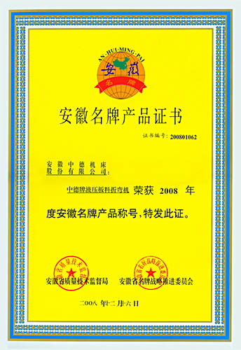 中德牌液壓板料折彎機喜獲2008年“安徽省名牌產(chǎn)品”的殊榮,這是繼2005年中德牌液壓擺式剪板機獲“安徽名牌產(chǎn)品”之后,中德機床的質(zhì)量和信譽又一次獲得認可。與此同時,中德牌液壓擺式剪板機也順利通過安徽名牌產(chǎn)品的復審,證書的有效期將延長至2013年。