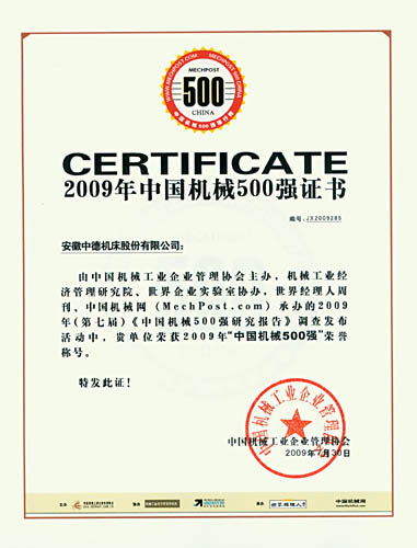 由中國(guó)機(jī)械工業(yè)企業(yè)管理協(xié)會(huì)主辦,機(jī)械工業(yè)經(jīng)濟(jì)管理研究院、世界企業(yè)實(shí)驗(yàn)室協(xié)辦,世界經(jīng)理人周刊、中國(guó)機(jī)械網(wǎng)承辦的2009年(第七屆)《中國(guó)機(jī)械500強(qiáng)研究報(bào)告》調(diào)查活動(dòng)公布,中德機(jī)床榮獲2009年“中國(guó)機(jī)械500強(qiáng)”。